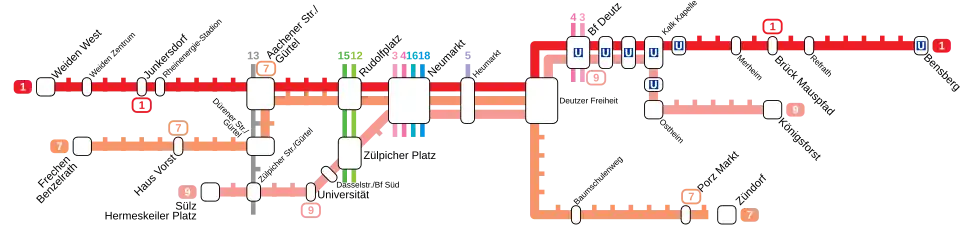 Společný úsek Neumarkt – Heumarkt – Deutzer Brücke využívá ve špičce 30 spojů za hodinu v obou směrech, což odpovídá intervalu dvou minut.