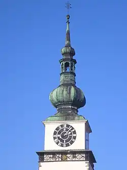 Na věži byly postaveny dvě báně oddělené lucernou. Stavba byla slavnostně dokončena 2. srpna 1862 osazením kříže.[23] Lidé z města si tehdy vypravovali, že do ve výšce umístěné a na pohled malé báně se ve skutečnosti vejde 10 měřic obilí.