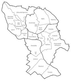 | Okres | Městská část | Místní část | Počet obyvatel | Rozloha (km2) | Připojení k městu | Poloha |