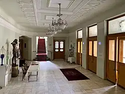 Secesní architektonický styl ovlivnil i podobu interiéru divadla, zejména přízemního vstupního vestibulu, foyeru a kuřárny v patře. Interiér však prošel řadou rekonstrukcí, během nichž došlo také ke změně půdorysu některých prostor a nedochoval se ani původní mobiliář.[10] Vestibul divadla má obdélníkový půdorys, omítky vyvedené do světle zelena a rovný strop s fabiony. Z vestibulu vedou diagonální chodby do šaten se vstupy do hlediště, po stranách jsou umístěna schodiště do patra potažená červenými koberci. Podobně jako vestibul je disponován i foyer, jemuž dominuje velký závěsný lustr. Na stěnách foyeru visí dvojice velkých obrazů znázorňujících výjevy z Mladé Boleslavi v 70. letech (byly přidány během rekonstrukce v letech 1977–1985). Oproti přízemí, v němž je vestibul na stejné výškové úrovni jako šatny, je foyer oproti šatnám v patře zvýšený z důvodu stupňování sedadel na balkóně. Hlavní vstupy na balkón hlediště vedou přímo z foyeru, boční z prostoru šaten. Ornamentální štuková výzdoba a římsy jsou ve všech těchto prostorách v secesním duchu.[11]