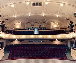 Hlavní sál divadla (Velká scéna) má hruškovitý půdorys, hlediště je tvořeno tmavě červenými sedadly v přízemí a na balkóně, který je zídkou rozdělen na dvě úrovně (tzv. druhý balkón má dva oddělené bloky se samostatným vchodem z foyeru). Hlediště kryje zavěšený strop ve tvaru lastury rozdělený pozlacenými štukovými ornamenty na pravidelné obdélníky. Boční stěny sálu v obou výškových úrovních hlediště obklopují lóže. První z nich zasahují až do prostoru předscény, jsou orámovány mohutnými polosloupy, na nichž sedí putti (barokní sochy nahých dětí). Na každé straně sálu navazují dvě lóže v přízemí a dvě v patře, které mají společný parapet se zbytkem balkónu. Omítky Velké scény jsou laděny do světle žluta s četným zlacením a její výzdoba je vyvedena v neobarokním stylu, využívá se zejména ornament doplněný pozlacenými festony.[11]