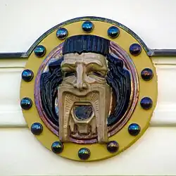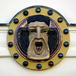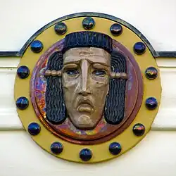 Průčelí budovy dominují dva mohutné pylony, na nichž stojí dvojice sousoší pražského sochaře Jana Štursy Probuzení národa (vlevo) a Vítězství umění (vpravo). Pod levým sousoším je na pylonu umístěn dvouocasý český lev, vpravo jednoocasý lev jako znak Mladé Boleslavi. Na bocích pylonů i dalších částí budovy jsou štukem vyvedeny letopočty MCMIX (1909). Uprostřed průčelí se před trojúhelníkovým štítem nachází socha sedící múzy Thálie podepřená dvěma sloupy, pod níž je umístěn zlatý nápis „Umění – síla života.“ V průčelí jsou dále tři menší a pod nimi tři vysoká okna s modrými rámy, která sahají až ke kovové, částečně prosklené skořepinové markýze, jejíž podpůrné sloupy nesou pozlacené monogramy MB. Pod konstrukcí markýzy je zavěšeno pět velkých elektrických luceren. Markýza kryje troje dveře, k nimž vede široké středové schodiště (při rekonstrukci v roce 2010 opatřené zábradlím) a stoupavý asfaltový nájezd ve tvaru písmene U (přízemí divadla je zvednuto nad úroveň terénu).
