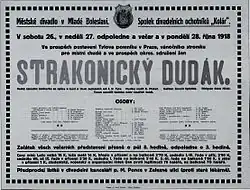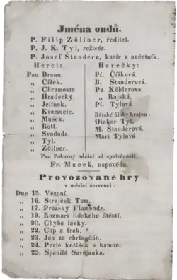 O rok později se kováňskému faráři Karlu Aloisi Vinařickému a koncipientovi krajského hejtmanství Františku Plačkovi po několikaleté snaze podařilo získat získat od úřadů povolení k sehrání českého představení.[19] Pódium, kulisy a oponu koupili od německých ochotníků, kteří v Mladé Boleslavi působili již od roku 1840.[14][20] První česky hrané ochotnické představení bylo sehráno 8. dubna 1843, jednalo se o inscenaci Žižkův meč autora Václava Klimenta Klicpery. V režii Josefa Kroupy se na představení podílelo 15 amatérských herců,[p 1] kteří výtěžek věnovali dětské opatrovně. V témže roce ochotníci sehráli ještě hry Tři hodiny před svatbou a Loupež.[14]