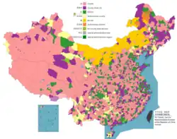 Existují i čtyři národnostní obvody (čínsky v českém přepisu cu-čchü, pchin-jinem zúqū, znaky 族区) vytvořené pro národnostní menšiny ve třech případech v Che-nanu a jednom v Chej-lung-ťiangu.