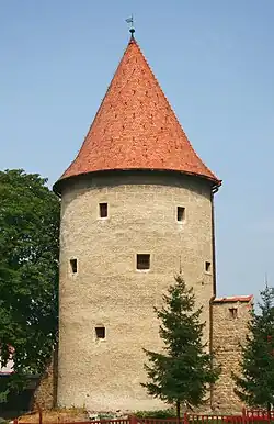 - Třípodlažní bašta se zachovalými konzolami na uchycení ochozu obíhajícího kolem zdi stojí v zahradě františkánského kláštera. Ve spodních podlažích jsou zachovány původní gotické klenby.