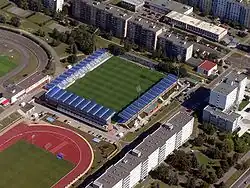 Hlavní fotbalové hřiště ve východním rohu areálu nese od roku 2019 sponzorský název Lokotrans aréna,[2] dříve Adidas aréna. Kapacita tří tribun je 5 000 míst k sezení.[1] Severní tribuna neexistuje. Stadion nabízí 50 míst pro tisk a oficiálně žádné místo k stání. Hrací plocha je vybavena vyhříváním trávníku a umělým osvětlením.