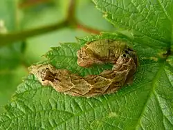 Housenky se živí listy maliníku a ostružiníku, přičemž preferují rostliny rostoucí ve stínu. Vzhledem připomínají ptačí trus, čímž se maskují proti predátorům.[2]