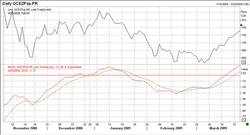 Ve vrchní části grafu se vyskytuje čárový graf kurzu cenného papíru. V dolní části grafu je červené MACD, zelená signální křivka a červená horizontální nulová přímka. Nákupní signál je identifikovatelný 24. listopadu 2008 nebo 20. února 2009, kdy MACD překřížilo signální přímku zdola nahoru. Naopak prodejní signál nastal dne 15. 1. 2009. Rychlý růst MACD je typický pro začátek listopadu 2008, což signalizuje překoupený trhu a možnou korekci, ke které opravdu došlo. Rostoucí trend v únoru a březnu 2009 byl potvrzen výskytem MACD a signální křivky nad nulovou přímkou. Naopak klesající trend v lednu a únoru 2009 byl potvrzen poklesem MACD a signální křivky dne 26. 1. 2009 pod nulovou přímku. Mírná divergence mezi kurzem cenného papíru a MACD nastala na konci února 2009, kdy trend kurzu byl mírně klesající a MACD již rostlo. Jednalo se tedy o býčí divergenci, neboli signál slábnoucího klesající trendu, který vyústil ve dno a následnou změnu trendu.