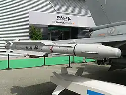 Letecká verze střely Mica IR v podvěsu pod křídlem letounu Dassault Rafale.