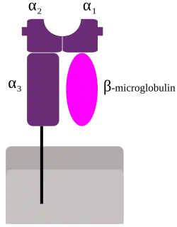 • β2 – mikroglobulin (β2-m): není polymorfní, je kódován mimo MHC – u lidí je lokalizován na 15. chromozomu, u myší na 2. chromozomu; molekulová hmotnost je 12 kDa