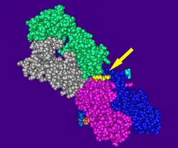 Vazba MHC I. třídy na T-buněčný receptor; žlutě je prezentovaný peptid