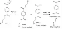 První objevený enzym podílející se na rozkladu PET, PETáza, jej štěpí na meziprodukty MHET (kyselinu 2-hydroxyethyltereftalovou) a malá množství BHET (bis(2-hydroxyethyl)tereftalátu). MHETáza hydrolyzuje esterovou vazbu MHET za vzniku kyseliny tereftalové a ethylenglykolu.