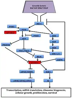 Zdá se, že množství růstových faktorů, aminokyselin, ATP a kyslíku jsou regulovány mTOR signalizací. Několik navazujících drah , které regulují progresi buněčného cyklu,[5] translaci, zahájení, transkripční reakce na stres,[6] protein stability a přežití buněk jsou signalizacány přes mTOR.
