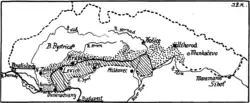 Stínované části označuji oblasti napadené Maďary, tečkované části označují oblasti s bolševickými nepokoji