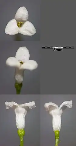Květenství je řídká lata s drobnými bílými, přisedlými nebo krátce stopkatými květy vyrůstajícími z úžlabí listenců, větve laty jsou delší než listeny. Oboupohlavný květ nemá kalich, pouze třícípou, srostlou korunu, která je úzce nálevkovitá, 4 mm dlouhá, bílá, trubku má asi 2 mm a cípy 1,5 mm. Květy jsou opylovány hmyzem. Plod je dvounažka okolo 2 mm dlouhá, tmavohnědá až černá, lesklá a lysá, která obsahuje dva polokulovité, na povrchu jemně zrnité plůdky.