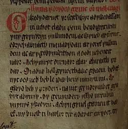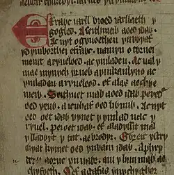 ![]() Několik úvodních řádků Mabinogi z Červené knihy hergetské (Pwyll, vládce dyvedský) | |