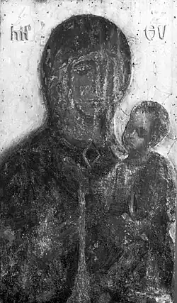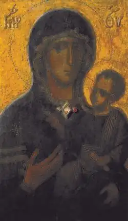 Obraz (ikona) představuje polofiguru Panny Marie v tmavě modrém plášti (peplum) s pokrytou hlavou (maforium), s desénem ze zlatých pruhů a z rovnoramenných zlatých křížků. Na krku má vsazenou kosočtverečnou sponu s relikvií v zasklené schránce s popiskou na pergamenovém pásku. Madona gestem pravé ruky věřícím „ukazuje cestu“, upozorňuje na Ježíška, respektive pobízí nás k jeho uctívání. Na levé paži drží Ježíška v podobě vzrostlého dítěte, oblečeného do dlouhé zřasené tuniky. Ježíšek pravou rukou žehná a v levici drží svitek textu (zákon – logos). V horních rozích obrazu jsou vytlačeny řecké zkratky slov MP Matka Boží (Mater theotokos). Obraz vznikl kopírováním starší předlohy, pravděpodobně ve 2. třetině 13. století nebo až po roce 1261; je namalovaný temperou na dřevěné desce, kterou tvoří tři prkna, dvě lipová a jedno topolové, spojená svlaky. Pozadí obrazu má křídový podklad, bylo zlacené a svatozáře ryté.