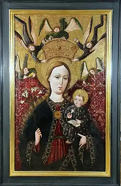 Stěžejním úkolem restaurátorů bylo časově i technicky náročné zpevňování dřevěné podložky, která byla silně poškozena hustě zatlučenými drobnými hřebíčky, nesoucími pozdější přízdoby. Po celoplošném odkryvu mladších přemaleb a zlacení byla zrestaurována gotická malba. Na okrajích výjevu se dochovalo gotické puncování, což dokazuje, že formát obrazu zůstal nezměněn a kompozice je celistvá. Obraz polopostavy Madony s korunou na hlavě a Ježíškem na rukou je ikonograficky nejblíže typu Madony královny nebes. Oblečený Ježíšek drží v jedné ruce knihu – připomínku evangelia a v druhé ruce má lilii – symbol nevinnosti. Madona drží stonek se sedmi květy lilií, znázornění sedmi bolestí a sedmi radostí Panny Marie. Andělé po stranách a ve středu koruny drží v jedné ruce korunu a ve druhé hřeby – symboly Kristova umučení. Vysoce kvalitní pozdně gotická malba pochází z Vratislavi z okruhu dílny Jacoba Beinharda z doby kolem roku 1500. Vratislavská provenience není přímo doložena archivními záznamy, ale je potvrzena stylovou analýzou díla a srovnáním s tvorbou Beinhardovy dílny, jež byla ve své době centrem umělecké tvorby ve Slezsku.