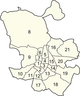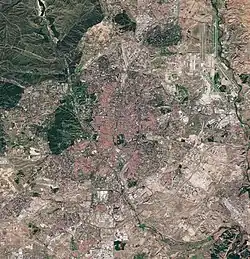 Nejstarší centrum se nachází na kopcích vedle levého břehu řeky Manzanares.[25] Město se dále rozrůstalo směrem na východ, směrem k údolí Abroñigal, jímž dnes prochází dálnice M30. Město se také rozrostlo díky začlenění sousedních sídel včetně těch na jihozápadě na pravém břehu Manzanares.