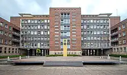 Hlavní část orientovaná severojižně je šestipatrová,[3] kolmé části na obou stranách jsou třípatrové a část vystupující do náměstí uprostřed zasahující téměř přes tři patra obsahuje sál[6]. Centrální průčelí je vyneseno na železobetonové nohy natřené tmavě šedou barvou. Je tak možné po obou stranách procházet pod budovou z náměstí do vnitrobloku. Nad oběma částmi je po celé délce prvního patra stříška, která je zakončena kovovým zábradlím světle modré barvy. To je tvořeno plochami plechu připomínající písmena A a V. V centrální části je na nohách pouze sál, zadní část budovy sedí na zemi a je zde široký vstup do budovy. V přízemí jsou čtvercové bloky oken zakryty bílým materiálem s malými kruhovými okny. Ta jsou k nalezení i v jižní části třípatrové části objektu až do výšky střechy.[3]