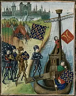 ![]() Francouzská flotila s Ludvíkem II. Bourbonským a praporem Oriflammem na stožáru | |||