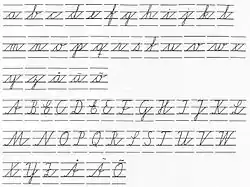 Psací písmo (jedna z variant): srovnání minuskul (nahoře) a majuskul (dole)