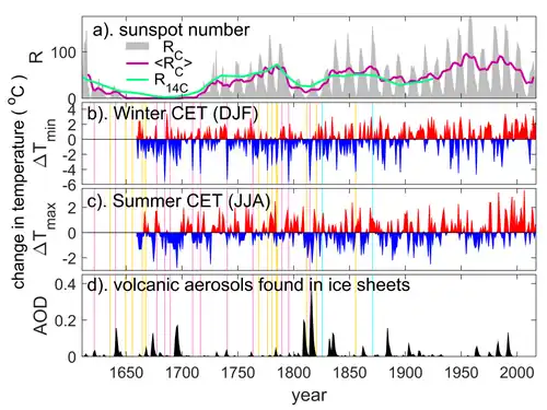 Studie Dmitrije Mauquoye a kol. potvrdila, že na počátku Spörerova minima prudce vzrostla míra produkce uhlíku-14.[66] Tito autoři tvrdili, že tento nárůst se shoduje s prudkým poklesem teplot odvozeným z evropských rašelinišť. Tento pokles teploty je patrný i v průměrných teplotách severní polokoule odvozených z celé řady paleoklimatických indikátorů, ale načasování začátku Spörerova minima je ve skutečnosti asi o 50 let dříve. 50leté zpoždění reakce je možné, ale není v souladu s následnými změnami odvozenými ze sluneční aktivity a průměrné teploty severní polokoule.[67] Například vrchol sluneční aktivity mezi Spörerovým minimem a Maunderovým minimem je 50 let po jediném vrcholu průměrné teploty severní polokoule, se kterým by mohl být spojen.