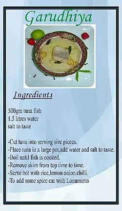 - Garudhiya, polévka jejímž základem je tuňákový vývar
