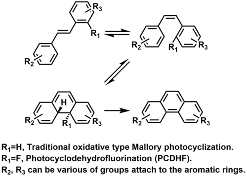 V roce 2015 byl popsán nový druh Malloryovy fotocyklizace, nazvaný fotocyklodehydrofluorace (PCDHF). Při cyklizací stilbenů nebo ortho-terfenylů s pentafluorfenylovými skupinami lze atomy fluoru použít jako odstupující skupiny.[17]