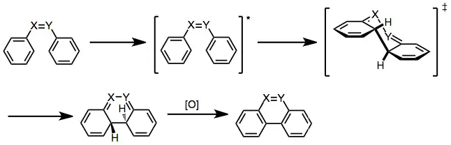 Nezávisle na přítomnosti nebo nepřítomnosti oxidačního činidla je prvním krokem fotochemická excitace stilbenu nebo podobné sloučeniny, která vytvoří dihydrofenanthrenový či obdobný meziprodukt. U stilbenu a dalších sloučenin s dvojnými vazbami mezi dvěma aromatickými jádry se takový excitovaný stav může vratně cis-trans izomerizovat. Přestože se samotné cyklizace mohou účastnit pouze cis struktury, tak je možné provést in situ izomerizace trans sloučenin a vytvořené cis izomery následně cyklizovat.[2] Aby byla dodržena Woodwardova–Hoffmannova pravidla, tak relativní trans konfiguraci na nově vytvořených centrech může vytvořit jen konrotačním průběh reakce.[7]