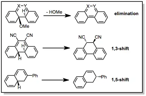 Za nepřítomnosti oxidačního činidla se většina dihydrofenanthrenů může vratně otevírat za tvorby odpovídajících cis-stilbenů; vhodně substituované stilbeny se ale cyklizují nevratně, pokud mohou proběhnout aromatizující eliminace nebo přesuny vodíků. Níže jsou uvedeny příklady takových reakcí:[8][9][10]