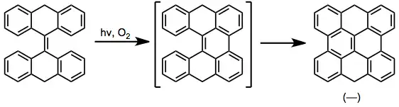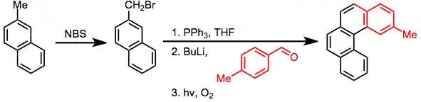 Fotocyklizace lze použít jako závěrečné kroky při vytváření kondenzovaných aromatických kruhů. Po benzylové bromaci N-bromsukcinimidem, přeměně na fosfoniovou sůl a Wittigově reakci s nearomatickým aldehydem fotocyklizací vznikne aromatická sloučenina. Opakováním tohoto postupu je možné získat heliceny.[18]