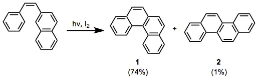 Stilbeny obsahující spojené aromatické systémy se dají získat cyklizacemi s využitím jednoho ze dvou neekvivalentních ortho uhlíků. To, který uhlík bude reagovat, určují sterické i elektronové efekty. Z elektronového hlediska přednostně reagují dihydrofenanthrenové meziprodukty s výraznější aromatickou stabilizací, například u 1-naftyl-2-fenylethenu elektronové efekty způsobí převažující tvorbu 1 oproti 2 v poměru 98,5:1,5.[12]