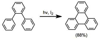 Ortho-terfenylované substráty se cyklizacemi za přítomnosti oxidačních činidel, například jodu, přeměňují na trifenyleny. Kyslík zde není vhodný, protože při jeho použití je otevírání kruhu a utváření stabilizovaných terfenylů rychlejší než oxidace.[13]