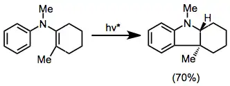 Z arylvinylaminů cyklizacemi vznikají indoliny a z diarylaminů karbazoly. V jedné studii byla, s mírným enantiomerním přebytkem, pomocí kruhově polarizovaného světla získána sloučenina 3:[16]