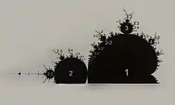 S využitím Fareyových zlomků[7] lze Mandelbrotovu množinu značit ještě přesněji pomocí metody vnitřního úhlu, z názvu laloku lze totiž odvodit, kde se přibližně nachází. Na stejném principu vyvinul matematik Robert Munafo[8] analytický pojmenovávací systém s názvem R2.[9] Stejně jako u Fordových kružnic, vrchní polovina hlavního kardioidu rozdělené reálnou osou (zjednodušeně značeno jako lalok 1, nyní se však jedná jen o horní polovinu rozdělenou reálnou osou) by byla značena a dolní . Druhý největší lalok, zjednodušeně značený jako lalok 2, má značení , zjednodušeně značený lalok 3 je a jeho zrcadlový protějšek pod reálnou osou . V čitateli je velikost koku a ve jmenovateli periodicita. Je to tedy Fareyův součet předchozích dvou Fareyových zlomků laloků.
