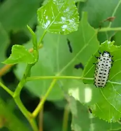 Larvy jsou až 15 mm velké, v mládí černé, později špinavě žlutobílé s černými skvrnami a bradavkami.[4]