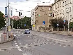 Vůz Tatra KT8D5 vypravený na výlukové pořadí linky 25 manipuluje v zastávce Hládkov | |||||||||||||||||||||||||||||||||||||||||||||||||||||||||||||||||||||||||||||||||