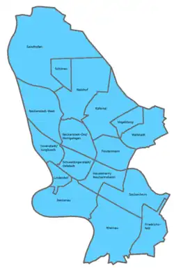 Centrum – „Quadratestadt“/Jungbusch, Mannheim-Lindenhof, Mannheim-Neckarstadt-východ/Wohlgelegen, Mannheim-Neckarstadt-západ, Neuostheim/Neuhermsheim, Mannheim-Schwetzingerstadt a Feudenheim, Friedrichsfeld, Käfertal, Neckarau, Rheinau, Sandhofen, Seckenheim, Schönau, Vogelstang, Waldhof a Wallstadt.