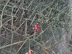 Mezi trny vyrůstají stopkaté, růžově načervenalé květy, objevují se osamoceně nebo častěji až po osmi v koncových hroznech 1 až 5 cm dlouhých. Květy jsou oboupohlavné, mají asi 2 mm dlouhé stopky a drobné listeny. Zvonkovitý kalich má pět široce trojúhelníkovitých lístků asi 2 mm dlouhých. Koruna, dlouhá asi 8 mm, bývá růžová nebo načervenalá. Kvetou v červnu až srpnu. Ploidie druhu je 2n = 16.