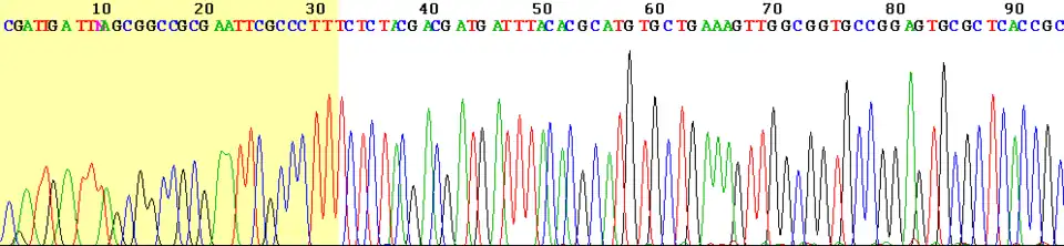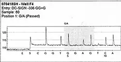 Sekvenování se dnes vyhodnocuje pomocí počítače; zde je zachycen výsledek sekvenování Sangerovou metodou