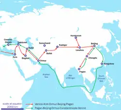Polové chtěli odsud plout do Číny, ale svůj úmysl neznámo proč změnili. Vydali se po souši na sever, vyprahlými oblastmi východní Persie, kde dlouhé dny neviděli živého tvora a jejich cesta byla lemována kostrami zvířat i lidí. Severním Afghánistánem přes pohoří Pamír a Turkestán pak dorazili na okraj největší asijské pouště Gobi a s karavanou se pustili přes ni.