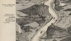 Panoramatický pohled na Ústí nad Labem v roce 1854, Mariánská skála s (nyní už zbořenou) kaplí P. Marie