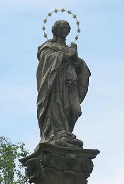 - Na sloupu s korintskou hlavicí je vztyčena socha Panny Marie Neposkvrněného početí, se sepjatýma rukama, oděná v řasnatém plášti. Šlape na hada a shlíží dolů. Kolem hlavy má kovovou svatozář s 12 hvězdami. Na dvou stranách soklu jejího sloupu jsou dvě plastické kartuše s erbem Františka Karla Libštejnského z Kolovrat: štít s rozkřídlenou orlicí pod hraběcí korunkou je orámován Řádem zlatého rouna (který byl Františkovi udělen roku 1688 jako prvnímu z tohoto rodu).