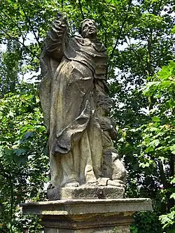 - Socha svatého Jana Nepomuckého s krucifixem v obou rukou stojí na soklu po Mariině pravici (na levé straně pozorovatele). Také na jeho podstavci je ze dvou stran kartuše s kolowratskou orlicí pod hraběcí korunkou. Jan Nepomucký je oděn v klerice, rochetě a superpeliciu, s biretem na hlavě. Stojí v obvyklé pozici, drží oběma rukama krucifix a otáčí k němu hlavu. Svatozář s pěti hvězdami chybí, stejně jako kovaná lucerna, doložená na fotografii z počátku 20. století[4].