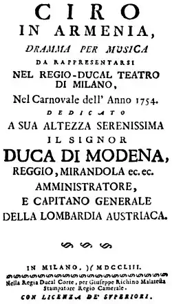 - Ciro in Armenia (dramma serio, libreto autorka, Milán, Teatro Regio Ducal, 1753)