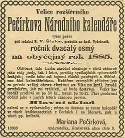 - ↑ Přátelům a čtenářům Pečírkova Národního kalendáře. Národní listy. 1904-08-13, roč. 44, čís. 223, s. 8. Dostupné online [cit. 2014-02-01].