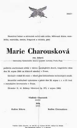 Marie Charousková (rozená Srbová; 25. října 1942 Otryby-Podveky, Okres Kutná Hora – 26. srpna 1968 Praha-Klárov) byla pětadvacetiletá matka dvouletého syna Jiřího, studentka strojní fakulty ČVUT a jedna z mnoha[p. 1] civilních českých obětí sovětské vojenské invaze do Československa v srpnu 1968.[4] Z její strany nezaviněná a zcela zbytečná smrt na pražském Klárově patří k historicky nejčastěji uváděným příkladům zločinů sovětských invazních vojáků během srpnové okupace Československa v roce 1968.[5]