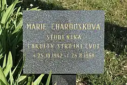 - ↑ a b c d e f Studentka Marie Charousková: Za nošení trikolóry zaplatila životem [online]. web: Vláda cz, 2008-08-06 [cit. 2023-08-13]. Dostupné online.