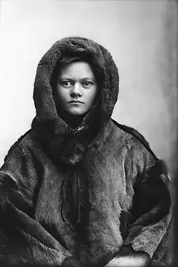 Marie Hoeg vztyčuje ukazováček na psa jménem Tuss, asi 1895–1903 -